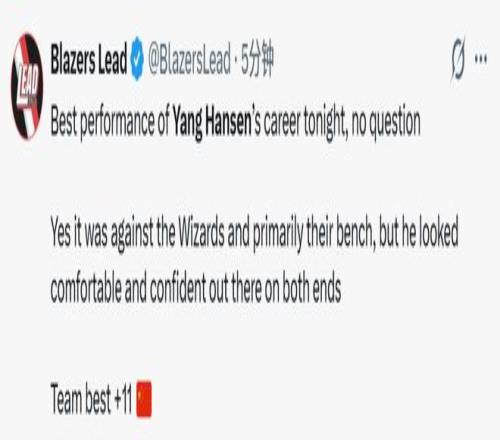 赛后,杨瀚森的表现也引起热议。开拓者媒体BlazersLead写道:“毫无疑问,这是杨瀚森职业生涯至今最出色的一场表现!没错,对手是奇才队,而且面对的大多是他们的替补阵容,但他在攻防两端都打得从容自信。正负值 + 11,全队最高。”