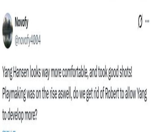 球迷novofy4004表示:“杨瀚森看起来比之前自在多了,投篮选择也很明智!他的策应能力也在提升,我们是不是该送走罗伯特(威廉姆斯),给杨瀚森更多成长空间?”