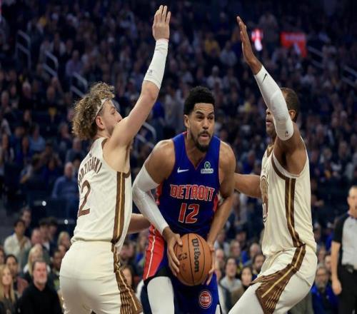 开局双方短暂胶着后,活塞迅速发力,首节末段轰出8-0攻击波,以45-37领先8分。次节活塞再送9-3攻势,杜伦造犯规、坎宁安连续得分,将分差扩大到14分。这两节活塞针对性锁死库里(迫使4次失误),专攻勇士内线薄弱点,通过高位挡拆与内线强攻的组合拳,让勇士防守顾此失彼,半场战罢以77-64手握13分优势。