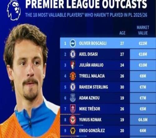 德转本赛季英超0出场球员身价:迪萨西、马拉西亚、斯特林在列 -